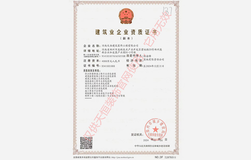 河南天恒建筑裝飾工程有限公司成立于2004年,注冊資金4000萬元,擁有正規(guī)的建筑裝飾工程設計專項乙級、建筑裝修裝飾工程專業承包壹級、防水防腐保溫工程專業承包壹級、地基基礎工程專業承包貳級、建筑工程施工總承包貳級、鋼結構工程專業承包貳級、城市及道路照明工程專業承包貳級、環(huán)保工程專業承包貳級等多個建筑業企業資質。